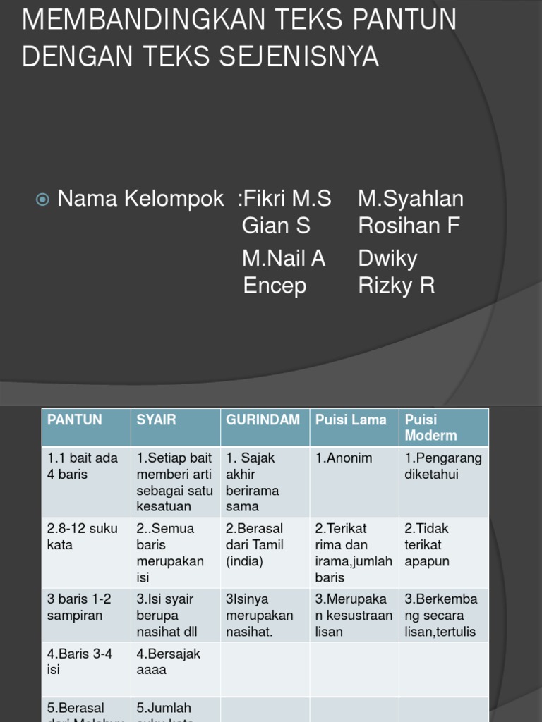 Tabel Persamaan Pantun Syair Dan Gurindam from id-jawaban.com Pantun syair dan gurindam termasuk ke dalam bentuk karya sastra dalam bahasa indonesia. Dua baris akhir dikenali sebagai isi atau maksud. Baris pertama merupakan sampiran dan baris kedua merupakan isi. Contoh pantun syair gurindam.materi ini dikembangkan berdasarkan kompetensi dasar 39 mengidentifikasi informasi pesan rima dan pilihan kata dari puisi rakyat pantun syair dan bentuk puisi rakyat setempat yang dibaca dan didengar. Berikut adalah persamaan pantun, gurindam dan syair : Fungsi rekreatif, yaitu sebagai sarana hiburan bagi para penikmatnya. Unsur yang di bandingkan adalah struktur dan kaidah teks tersebut. Baris pertama merupakan sebab atau persoalan sedangkan baris kedua merupakan akibat atau penyelesaian.