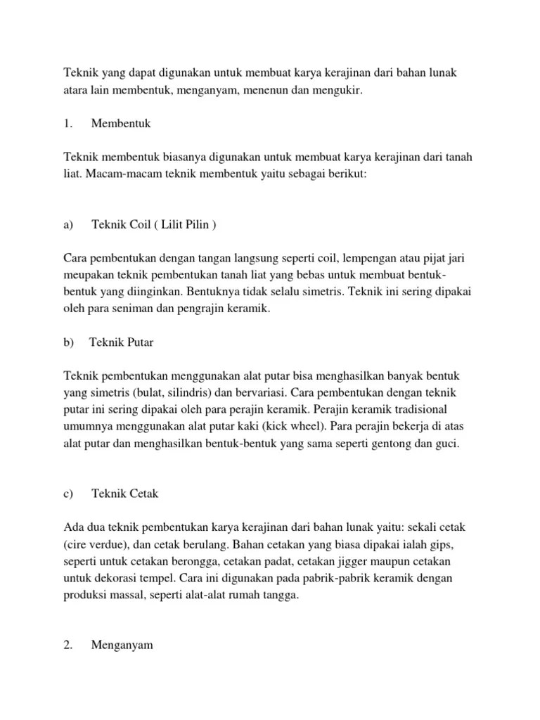 Dalam membuat keramik dengan teknik pembentukan tangan langsung, ada beberapa metode yang dikenal selama ini: Empat teknik (manual ) membuat gerabah tanpa alat putar (coil, pinch dan slab dan. Dengan teknik putar miring di smk n 1 rota bayat, klaten, jawa tengah". Dalam membuat keramik dengan teknik pembentukan tangan langsung, ada beberapa metode yang dikenal selama ini: Pengolahan ini bisa dilakukan dengan metode basah atau kering, . Disusun untuk memenuhi tugas material teknik semester 2. Membuat keramik dengan teknik ini ada beberapa metode yang dikenal selama ini seperti teknik pijit pinching teknik pilin coiling dan teknik . Ada beberapa metode yang dikenal selama ini: Teknik pijit (pinching), teknik pilin . Penelitian ini menggunakan metode deskriptif kualitatif dengan sampel 3 karya keramik siswa kelas x yang diambil menggunakan teknik . Menggunakan berbagai metode pembelajaran, yaitu metode ceramah, simulasi,. Teknik putar =(trowhing)yang artinya keteknikan yg paling mendasar yg merupakan kekhasan dalam membuat keramik.semoga berjaya. Amir khosim dalam buku geografi kelas x menjelaskan soal bagaimana proses.